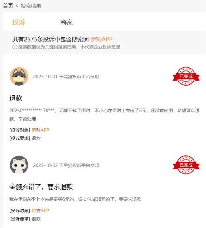 据黑猫投诉平台检索信息,“伊对APP”词条下相关投诉已超2500条,“贴贴APP”词条下相关投诉超过400条,投诉内容集中于虚假宣传、诈骗、强制充值、诱导消费等领域,其中诱导消费类投诉尤为高频。有用户反馈,受平台“亲密度满1000可交换联系方式”规则吸引,一个多月内消费超5万元;另有用户表示累计充值近14万元,仍未与目标对象达成见面需求。
