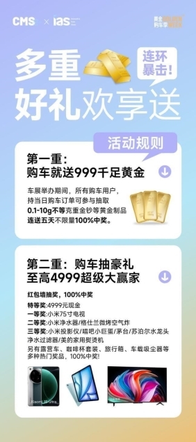 现场购车用户可赢取包括999千足黄金定制礼品、高端智能家电及4999元现金大奖在内的专属礼遇,以精准消费激励政策与优质体验,打造高品质消费场景,激发汽车市场消费新动能。